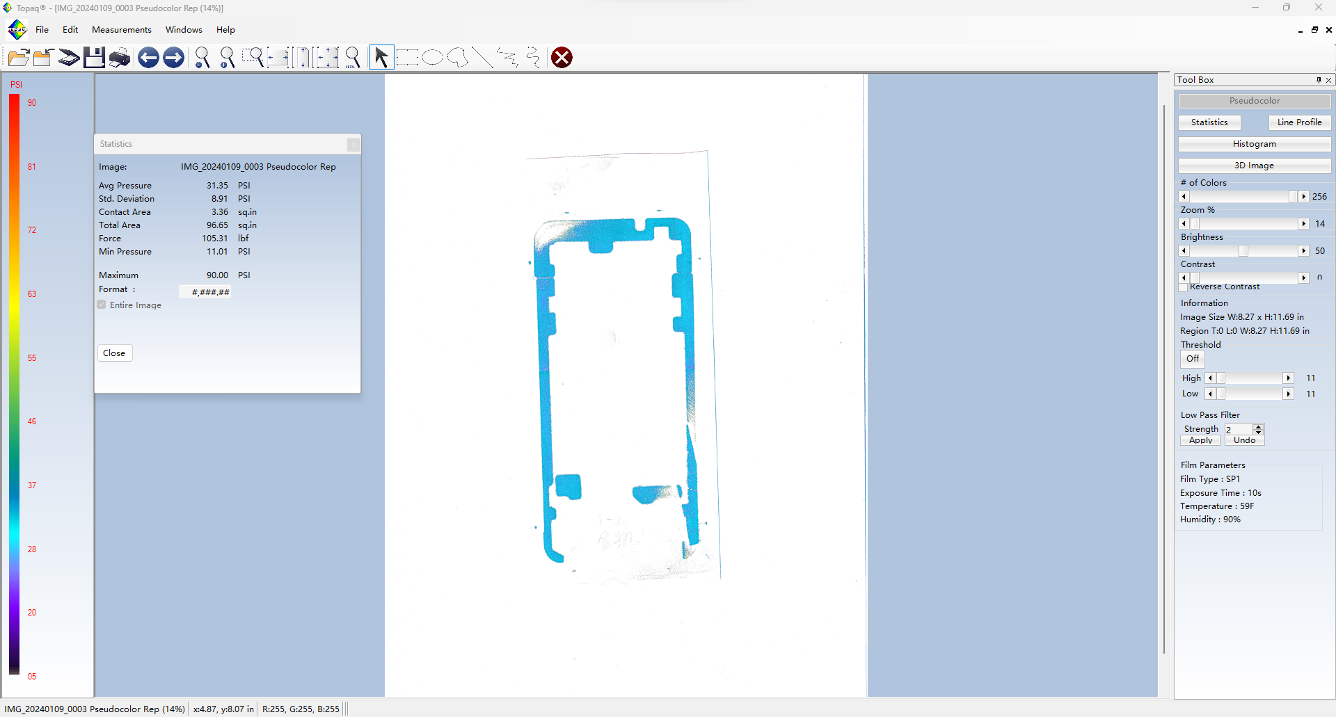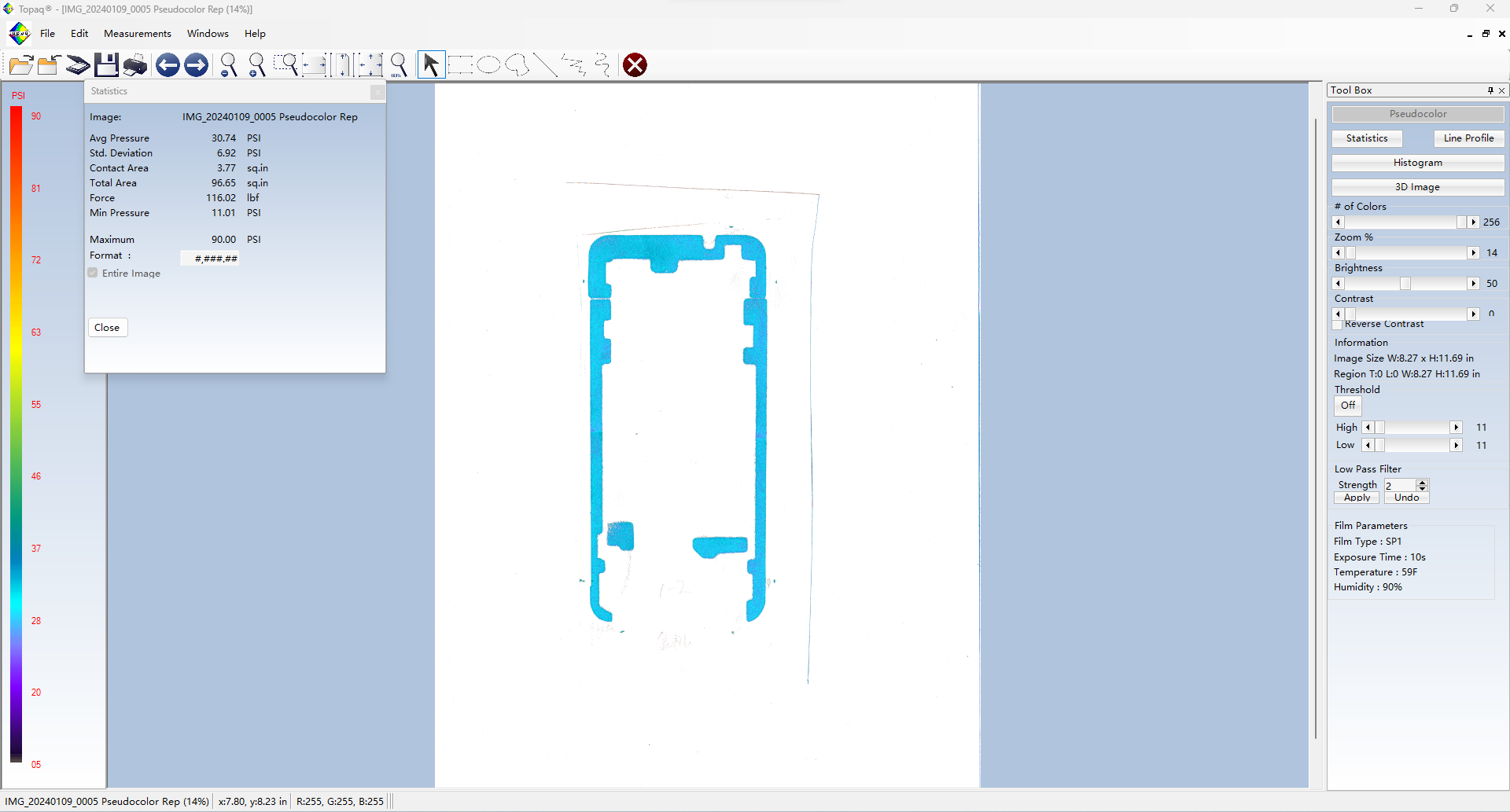 Topaq 感壓紙數(shù)據(jù)分析系統(tǒng):由經(jīng)過特殊校準的密度掃描儀和Windows軟件組成。通過掃描壓敏紙上的圖像可以在軟件里量化成具體的數(shù)據(jù)值,可以將壓敏紙呈現(xiàn)的圖像轉(zhuǎn)換成3維圖像。并可以根據(jù)色階區(qū)分力值大小。
